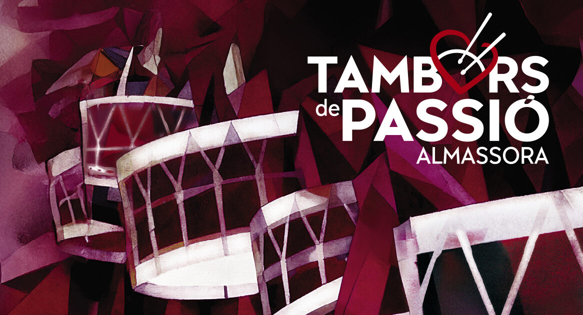 El cartel propone una interpretación contemporánea y simbólica de Tambors de Passió poniendo el foco en la fuerza colectiva, el ritmo y la emoción que definen este acto. Los tambores aparecen fragmentados y superpuestos, generando una sensación de movimiento continuo y repetición rítmica que remite directamente al sonido insistente y envolvente de la percusión en la noche de Jueves Santo en Almassora. La gama cromática, evoca la pasión, el recogimiento y la intensidad emocional propia de la Semana Santa, mientras que las formas angulosas y geométricas refuerzan la tensión y la energía del momento.