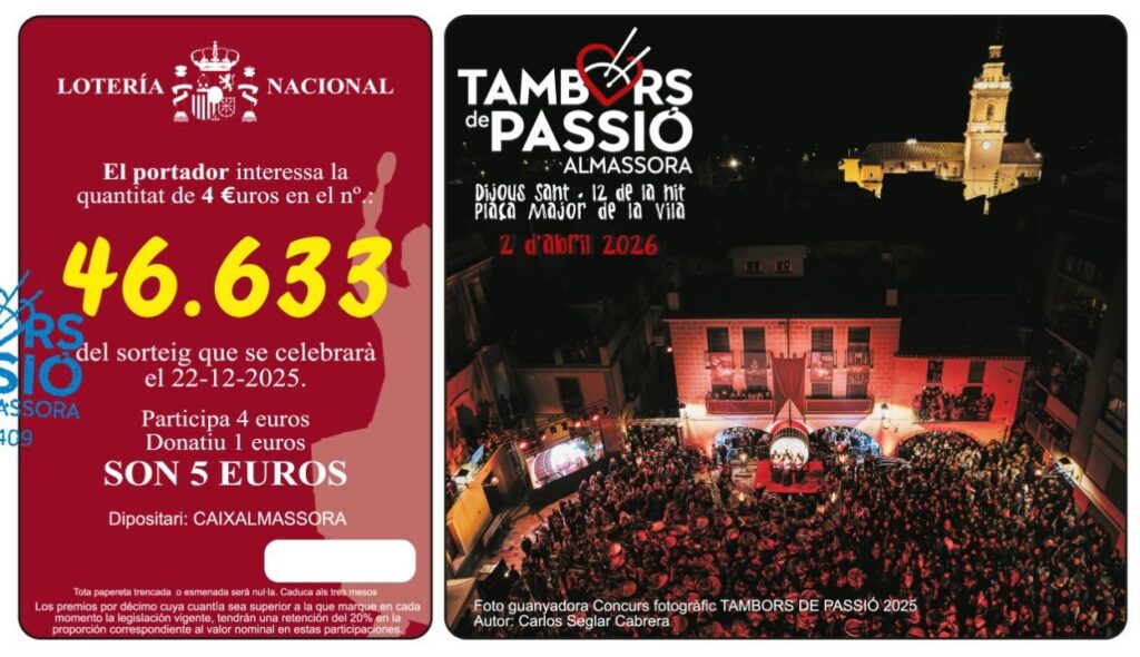 Cabe destacar que la imagen visible en la participación de la lotería de Navidad 2025 es la premiada en el concurso fotográfico Tambors de Passió 2025. Carlos Seglar Cabrera se llevó el triunfo con esta espectacular vista aérea de la plaza Mayor en el momento de apogeo de la rompida. Un reconocimiento que muestra la calidad del artista gráfico ganador en varias ocasiones de este premio. Así, invitamos de nuevo a los fotógrafos de todo el territorio a participar y también gozar de este distintivo tan especial.